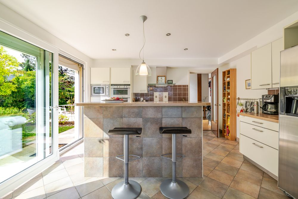 Le rez-de-chaussée propose un hall d’entrée, un vaste séjour lumineux, une cuisine conviviale, une chambre/bureau ou espace de rangement ainsi qu’un WC visiteurs avec douche. Le local technique avec la chaudière à gaz est aussi sur ce niveau.
