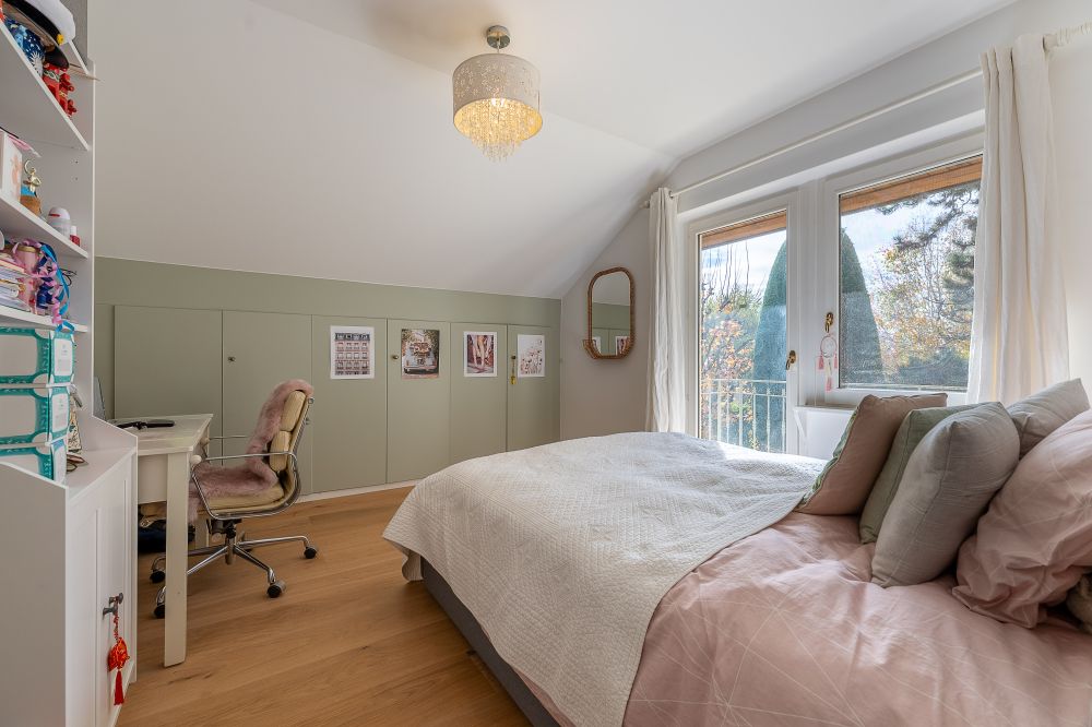 À l’étage, la suite parentale avec dressing et salle de bains privative forme un véritable cocon, tandis que trois chambres lumineuses disposent de rangements intégrés.
