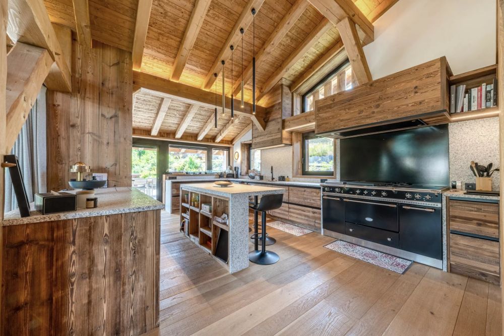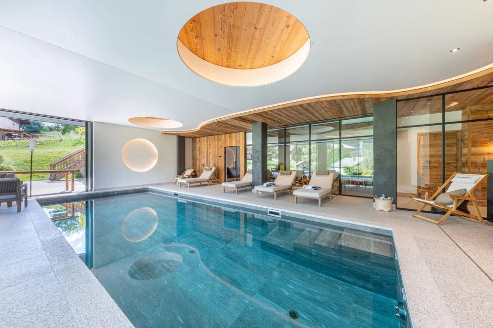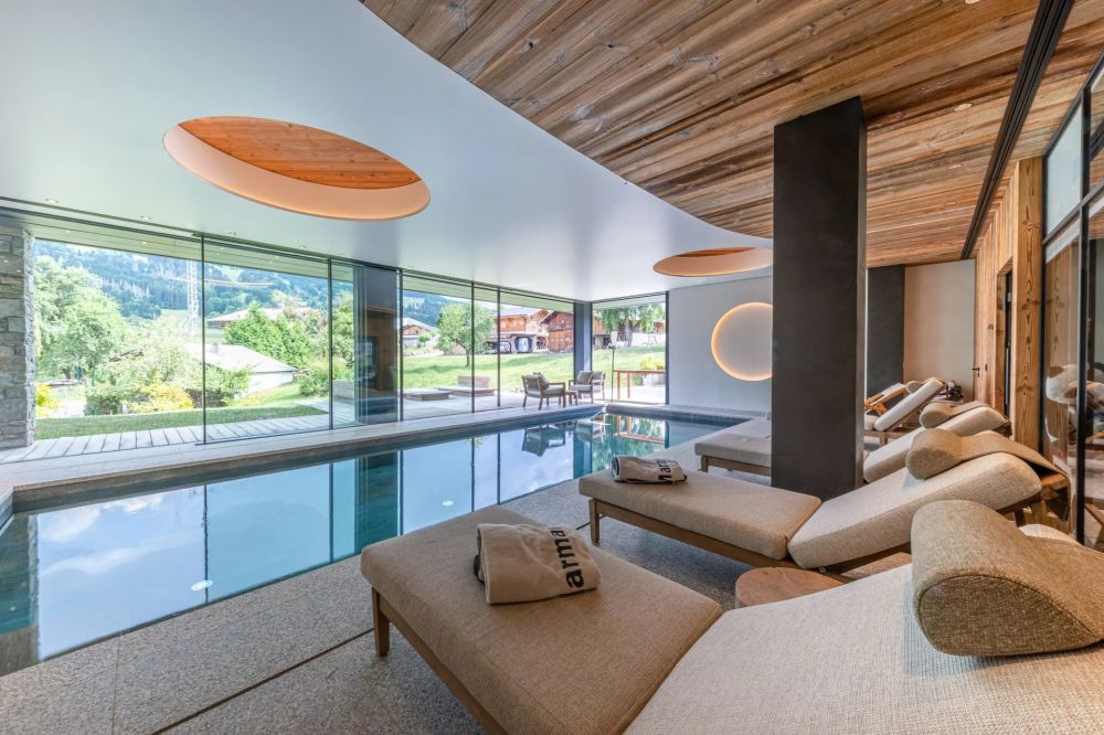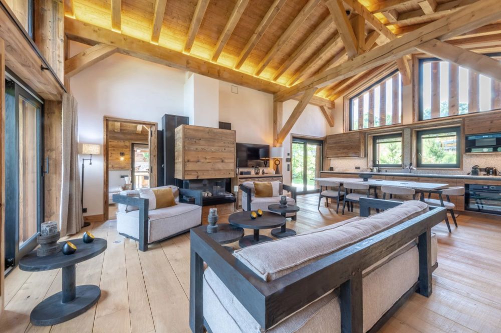 Le chalet principal s’organise autour d’un vaste espace de vie avec cheminée, d’une cuisine dessinée par Michel Rostang, de trois suites, d’un bureau avec fumoir et cave à vins, d’un ascenseur, ainsi que d’un espace bien-être complet : piscine intérieure avec ouverture sur l’extérieur, hammam, salle de sport.