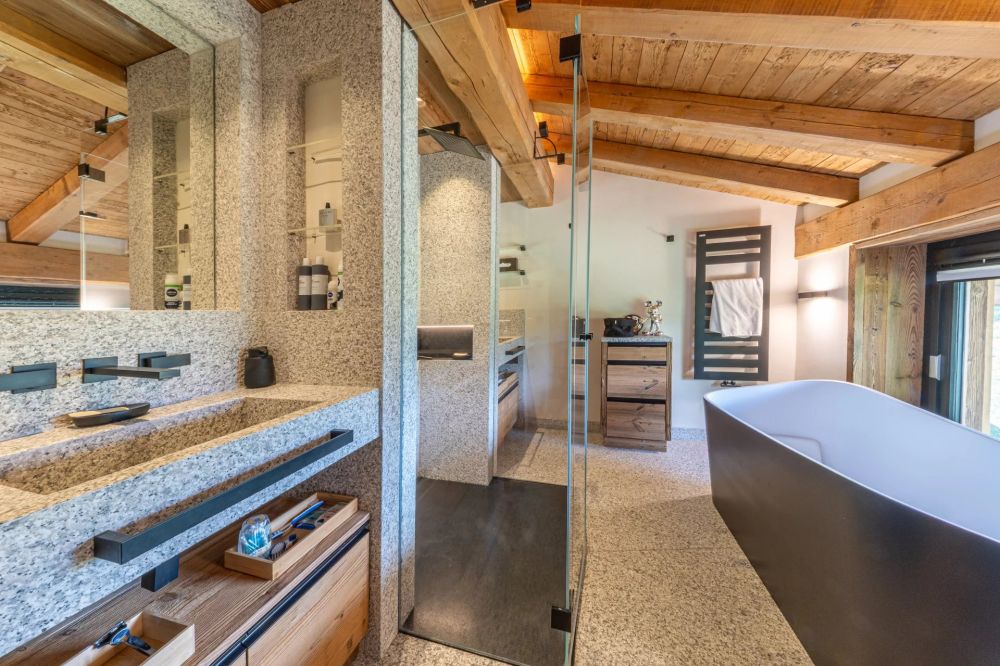 Les matériaux ont été choisis avec exigence : granit du Mont-Blanc, chêne massif, finitions sur mesure. Chaque espace est pensé avec justesse, entre confort et raffinement.