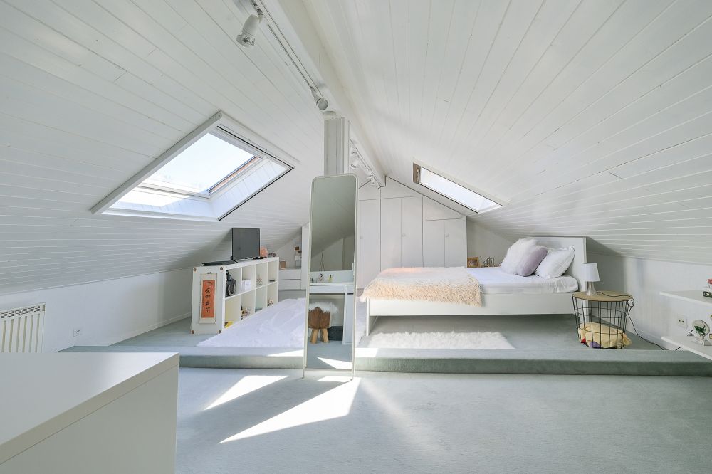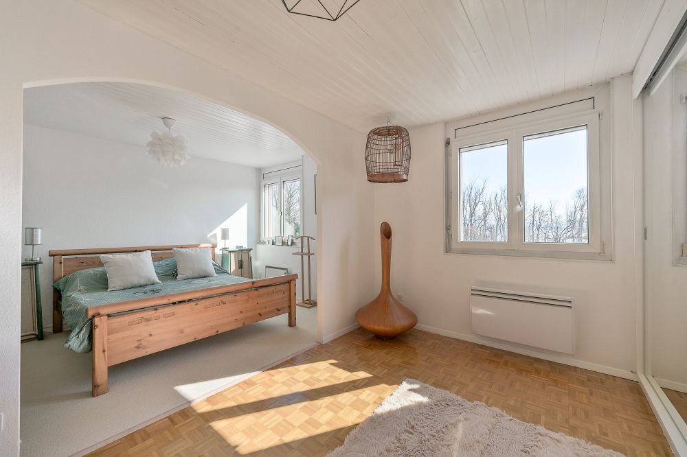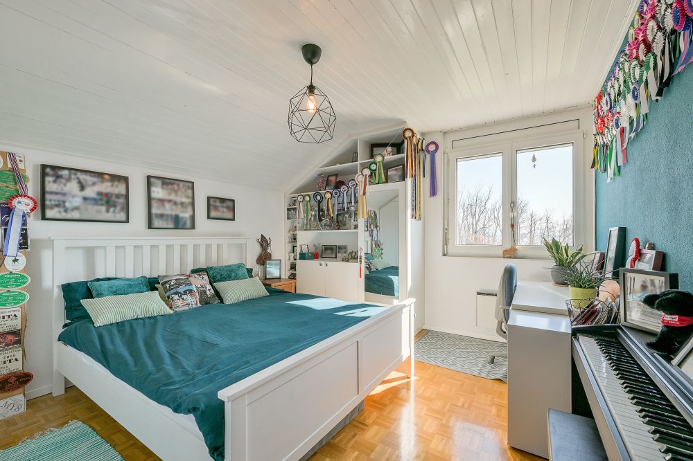 La maison comprend actuellement quatre chambres de bonnes dimensions, avec la possibilité d’en créer une cinquième selon les besoins. Les combles offrent également un espace polyvalent, parfait comme salle de jeux, bureau ou chambre supplémentaire.