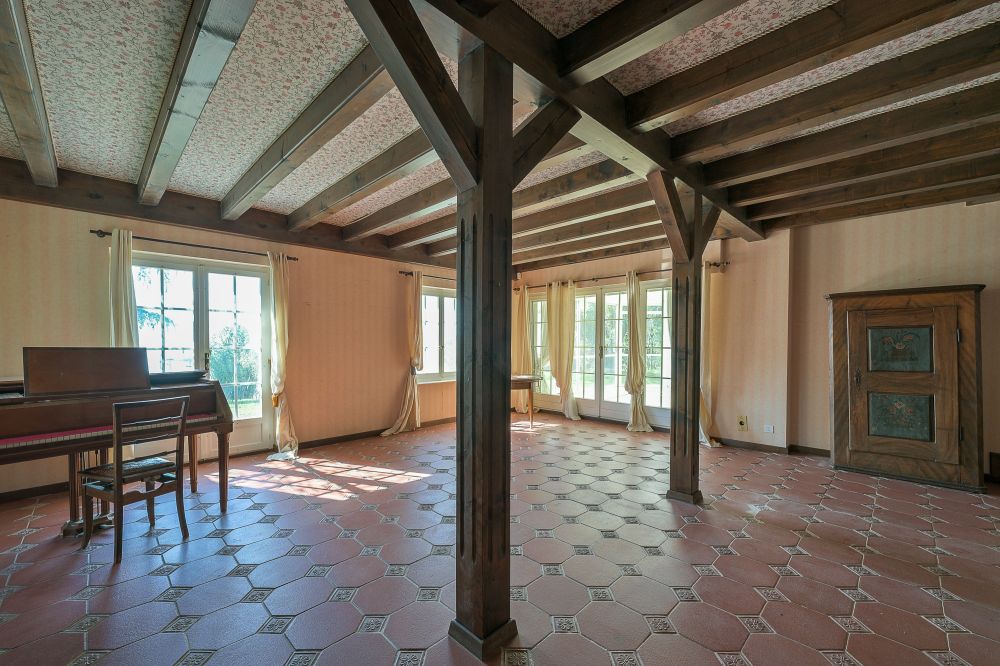 Dès l’entrée, un hall accueillant dessert un WC visiteurs, un local technique, une buanderie ainsi qu’un abri anti-atomique. L’espace de vie principal séduit par ses volumes et sa luminosité, avec une cuisine ouverte sur le jardin, une salle à manger conviviale et une agréable véranda prolongeant les espaces vers l’extérieur. Un vaste salon avec cheminée, baigné de lumière, offre un accès direct au jardin ainsi qu’une superbe vue sur le lac.