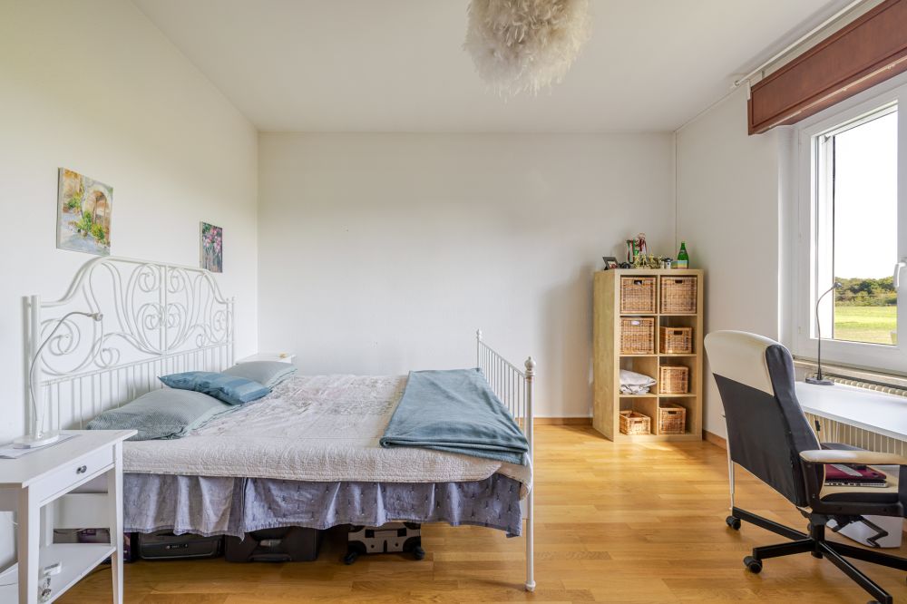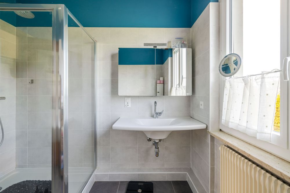 Le rez-de-chaussée propose un hall d’entrée, un vaste séjour lumineux, une cuisine conviviale, une chambre/bureau ou espace de rangement ainsi qu’un WC visiteurs avec douche. Le local technique avec la chaudière à gaz est aussi sur ce niveau.