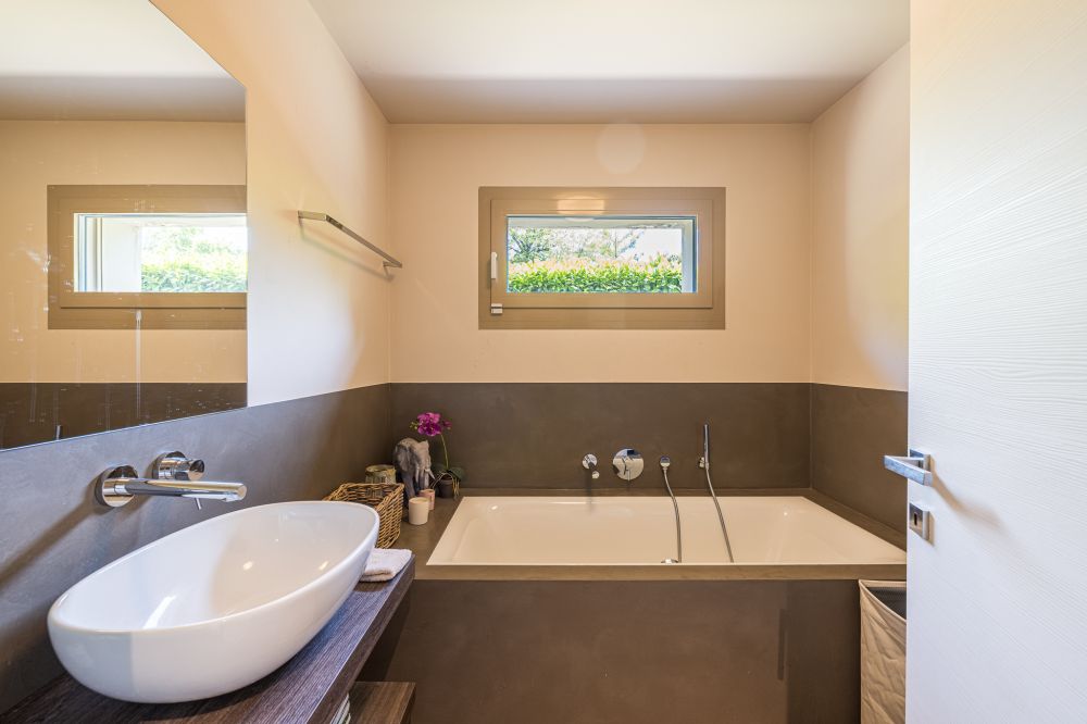 Le sous-sol propose un bureau, une cave à vin et cave de rangement, un espace technique, une buanderie, une salle polyvalente, une salle de bain et un accès direct au parking.