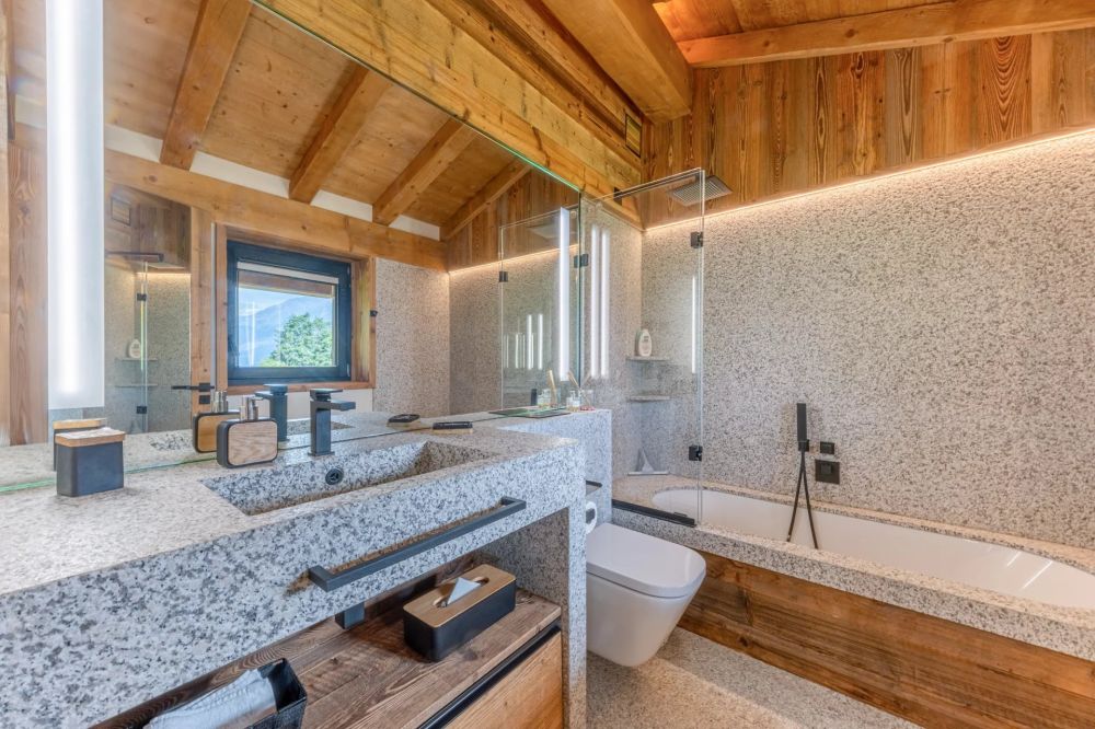 Les matériaux ont été choisis avec exigence : granit du Mont-Blanc, chêne massif, finitions sur mesure. Chaque espace est pensé avec justesse, entre confort et raffinement.