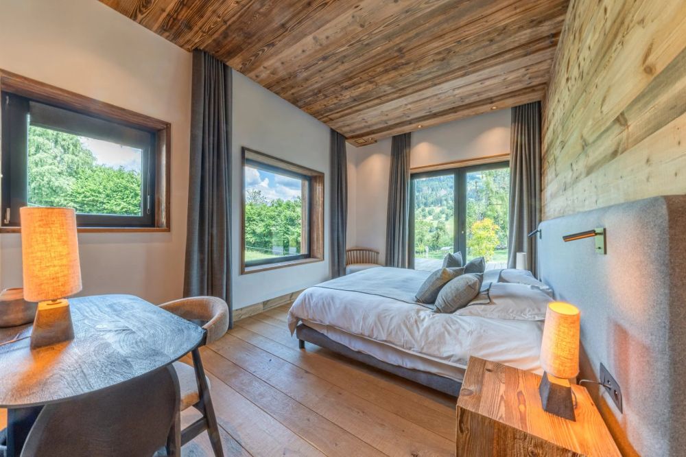 Le chalet principal s’organise autour d’un vaste espace de vie avec cheminée, d’une cuisine dessinée par Michel Rostang, de trois suites, d’un bureau avec fumoir et cave à vins, d’un ascenseur, ainsi que d’un espace bien-être complet : piscine intérieure avec ouverture sur l’extérieur, hammam, salle de sport.