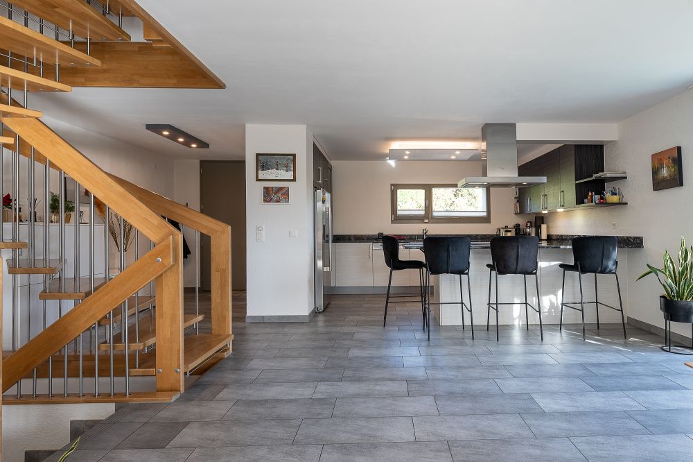 Le sous-sol chauffé entièrement aménagé comprend une belle pièce polyvalante, une salle de douche/buanderie, et un accès directe au garage double fermé. Cet étage bénéficie d’une excellente hauteur sous plafond. Une cave, une cave à vin et une place extérieure complètent cette offre.