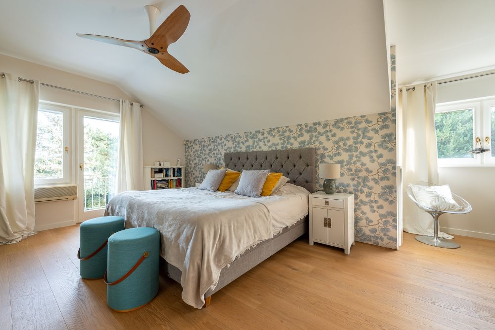 À l’étage, la suite parentale avec dressing et salle de bains privative forme un véritable cocon, tandis que trois chambres lumineuses disposent de rangements intégrés.